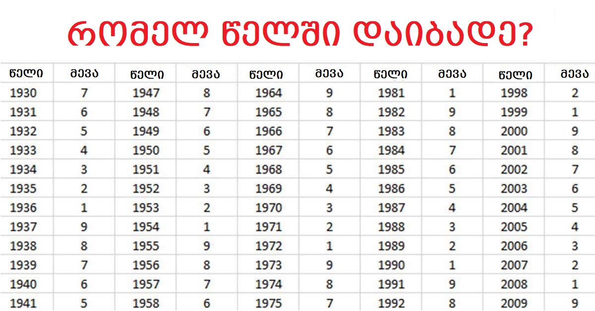 მევას განსაზღვრა მარტივია-იპოვნეთ ცხრილში დაბადების წელი და მისი შესატყვისი მევა.
