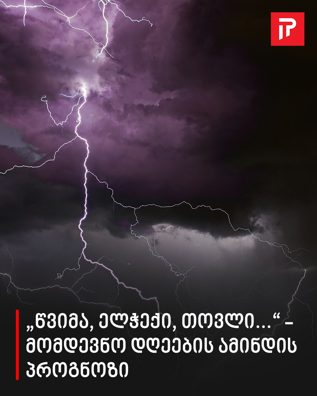 აღმოსავლეთ საქართველოში – დროგამოშვებით ღრუბლიანობის მომატება. ზოგან ხანმოკლე წვიმა და ელჭექი, შესაძლებელია ძლიერი და სეტყვა, მაღალმთაში ზოგან თოვლი. დასავლეთის 10-15მ/წმ. ჰაერის ტემპერატურა: ბარში ღამით +2, +7°, დღისით +14, +19°; მთაში ღამით -1, +4°, დღისით +11, +16°; მაღალმთაში ღამით -4, +1°, დღისით +3,+8°, ზოგან +13°-მდე.