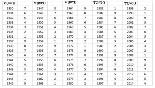 თქვენ მხოლოდ ის გევალებათ, რომ მოცემულ ცხრილში მოძებნოთ რიცხვი, რომელიც თქვენს დაბადების წელს ეკუთვნის და შესაბამისად კი წაიკითხოთ ამ რიცხვისთვის განკუთვნილი ახსნა.